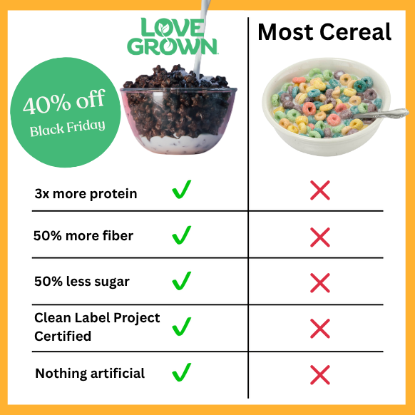 Cereal: Most cereals rely on empty grains like corn, which is low in protein and fiber. Love Grown is different—made with a trio of mighty beans that delivers more protein and fiber to keep you full longer. We wanted to make sure that our cereal still had that great crunch and flavor we love - but we found a way to do it with 50% less sugar and none of the artificial ingredients a lot of cereals rely on. Plus- Love Grown is the only cereal that is Clean Label Project Certified.