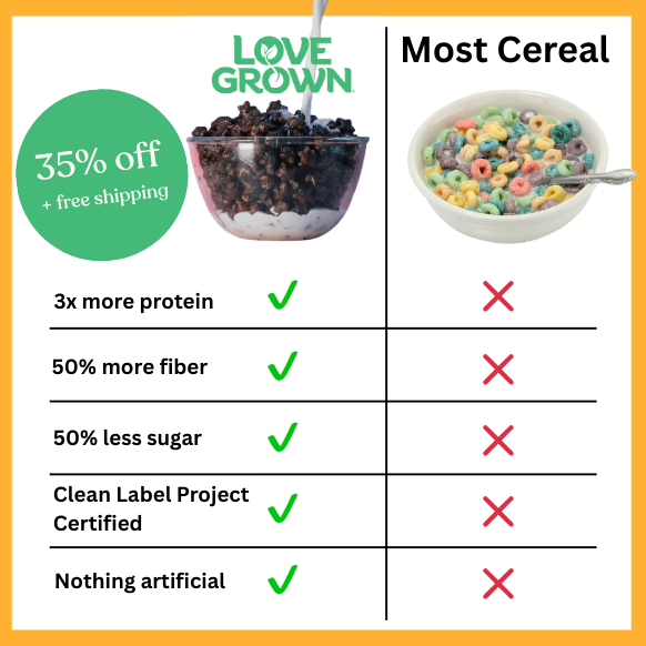 Cereal: Most cereals rely on empty grains like corn, which is low in protein and fiber. Love Grown is different—made with a trio of mighty beans that delivers more protein and fiber to keep you full longer. We wanted to make sure that our cereal still had that great crunch and flavor we love - but we found a way to do it with 50% less sugar and none of the artificial ingredients a lot of cereals rely on. Plus- Love Grown is the only cereal that is Clean Label Project Certified.