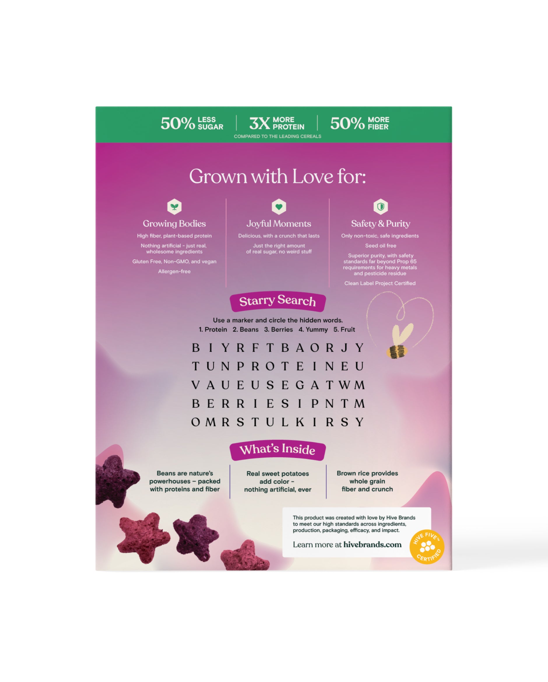 Unlike mass-market cereals, there’s nothing artificial about them: We use just enough real sugar and color from veggies; plus they’re seed-oil free, gluten-free, vegan, certified non-GMO and will never include anything artifical.