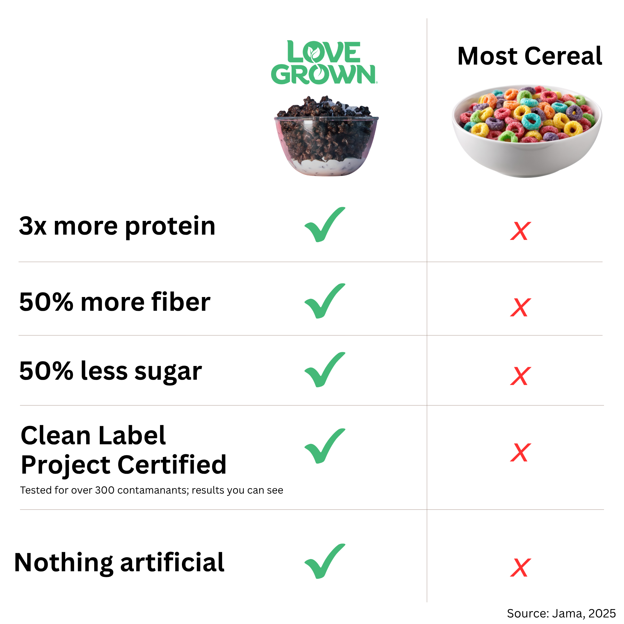 Love Grown is different—made with nutrient-dense beans for a more balanced breakfast with more protein, fiber, and clean ingredients to fuel your day. No artificial junk, no fillers, and less sugar!Plus- Love Grown is the only cereal line that is fully Clean Label Project Certified.